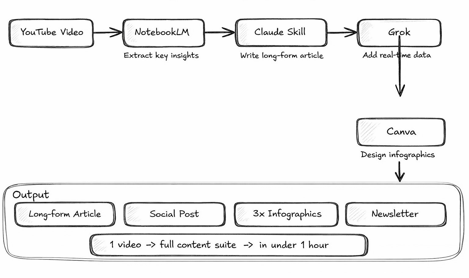 You are transforming a YouTube video into a comprehensive set of content. NotebookLM can be used to get the important insights from the complete transcript. You use those insights to write a long-form article with a Claude Skill. The article is provided to Canva for the purpose of creating viral infographics.