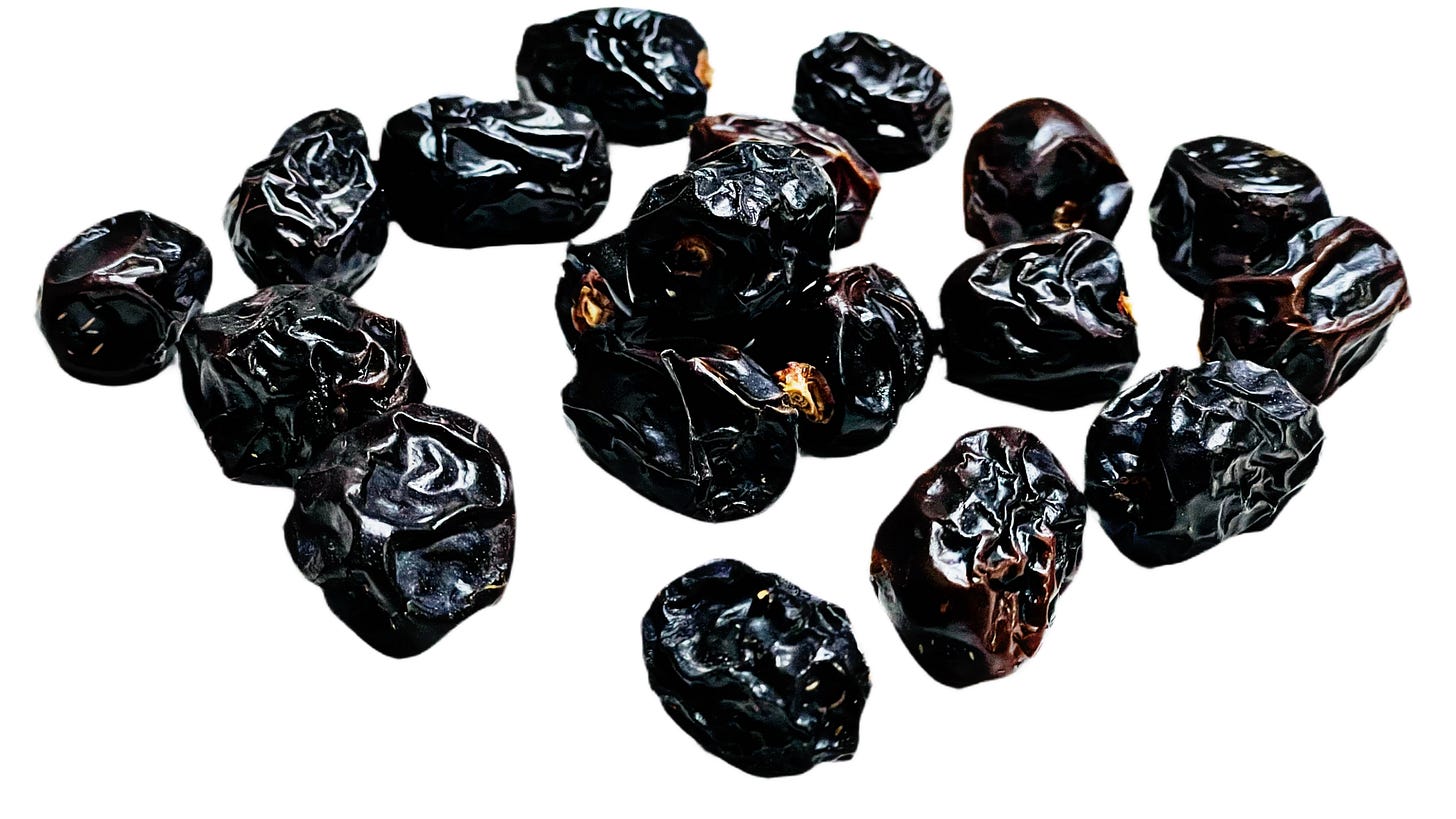 Ajwa dates are black in color and are also known as the King of All Dates; they are typically available in a variety of sizes (prices increase as size increases). 12 small to medium ones weigh about 100g. Ajwa has the highest iron content of any date, nearly double that of any other type.